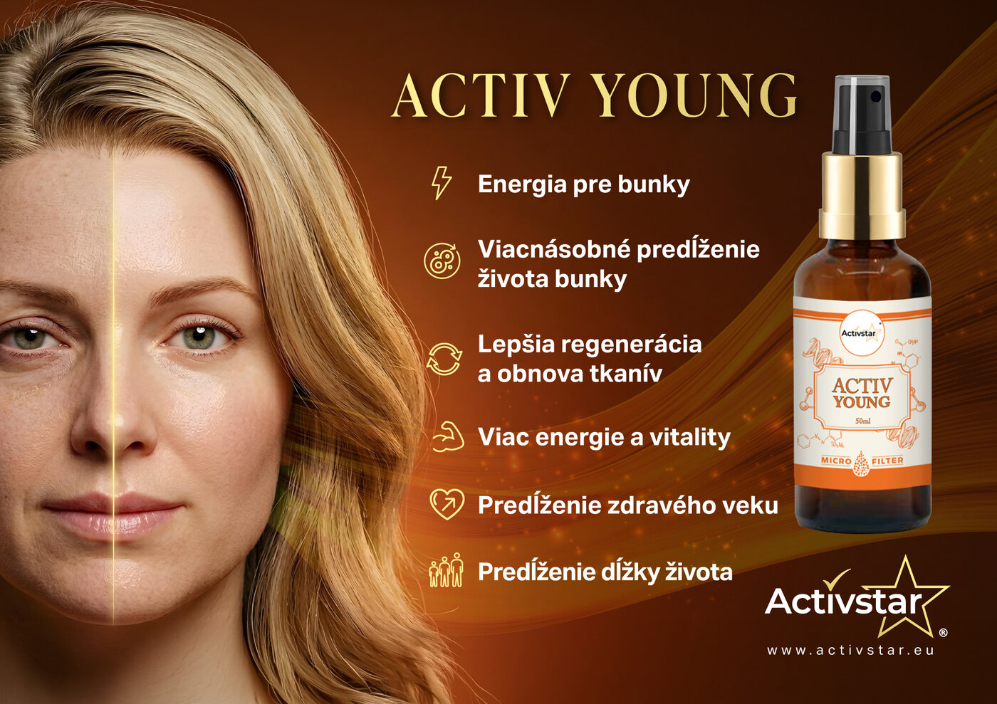 Ez az elv áll az Activ Young - egy modern regeneráló spray mögött, amelyet a sejtek energiájának, a test regenerálódásának és a természetes vitalitásnak az elősegítésére terveztek.