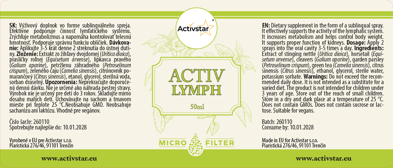 Az Activ Lymph spray egy természetes, nyelv alatti spray, amely a gyógynövénykivonatok erejét hasznosítja a nyirokrendszer megfelelő működésének támogatására. Segít a szervezetnek a méreganyagok, felesleges folyadékok természetes elvezetésében és erősíti az immunrendszert.