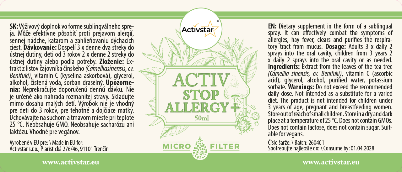 Az Activ Stop Allergy+ egy táplálékkiegészítő készítmény kényelmes szublingvális spray formájában, amelyet napi használatra terveztek a szervezet fokozott igénybevételének időszakában.