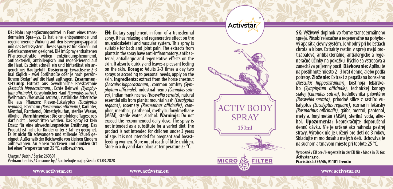 Az ACTIVBODY SPRAY egy innovatív táplálékkiegészítő transzdermális spray formájában. Mindazok számára készült, akik hatékony és gyors segítséget keresnek testük ápolásához, és egy nehéz nap vagy sportteljesítmény után a regenerálódás támogatására van szükségük.