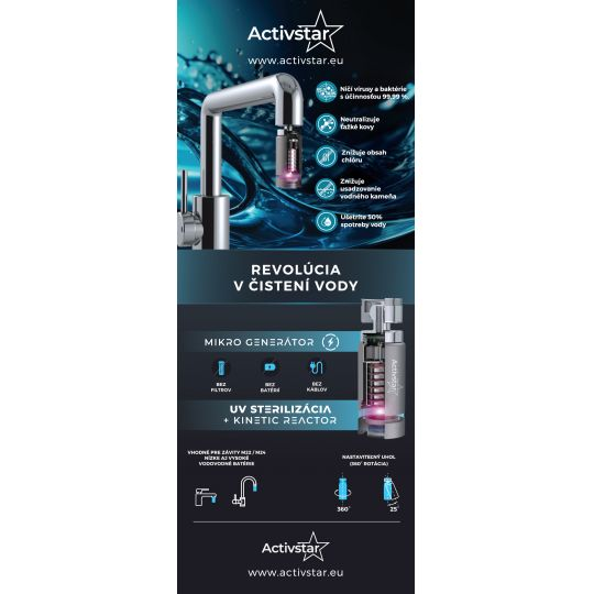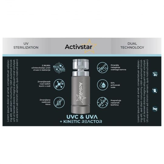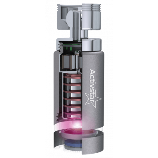 Az Activstar reaktor egy forradalmi víztisztító termék, amely 2 technológiát ötvöz - a víz sterilizálását UVC és UVA sugarakkal és a víztisztítást a Kinetikus Reaktor segítségével. A termék forgócsuklóval van felszerelve. Könnyedén a kívánt irányba irányíthatja a vízáramot. A telepítés nagyon egyszerű. Egyszerűen távolítsa el a hagyományos gyöngyözőt (csaptelep csapcsonkot) és szerelje be.